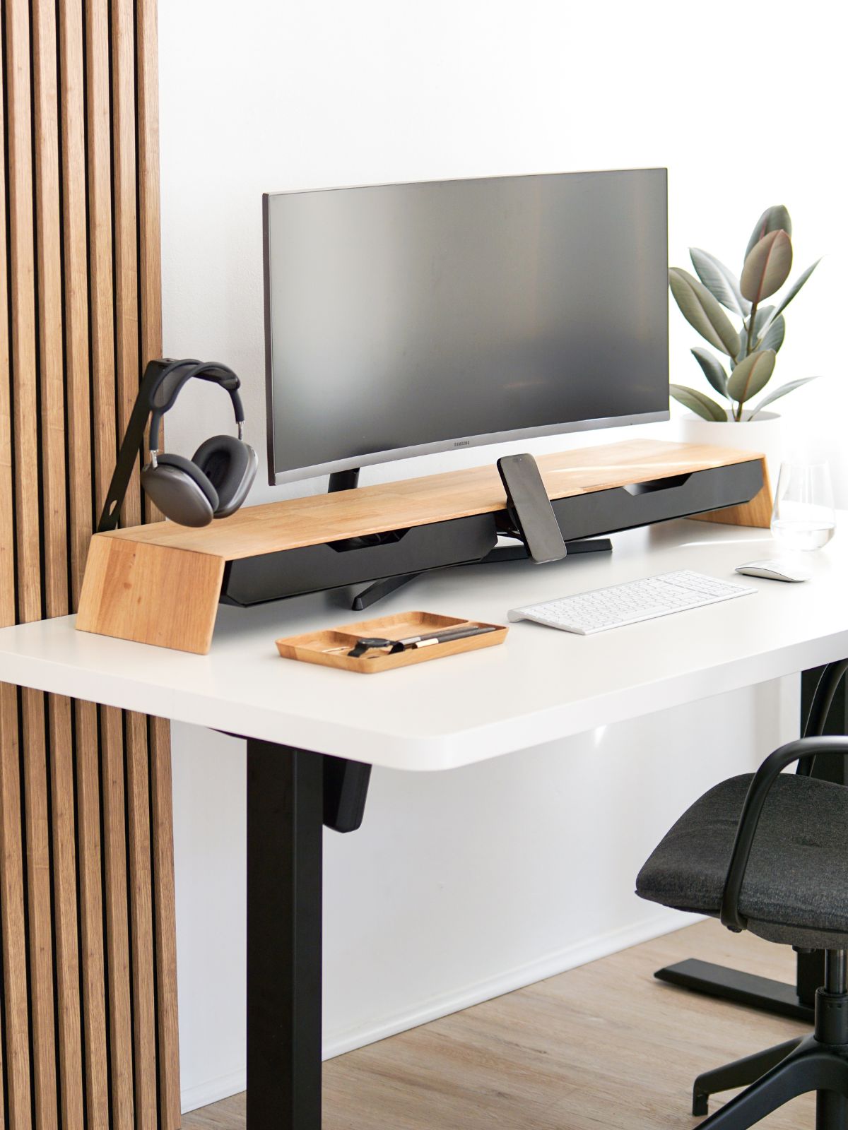 Optimiere deinen Arbeitsplatz mit unseren Monitorerhöhungen, Laptophalterungen und Add-Ons aus massivem Eichenholz.