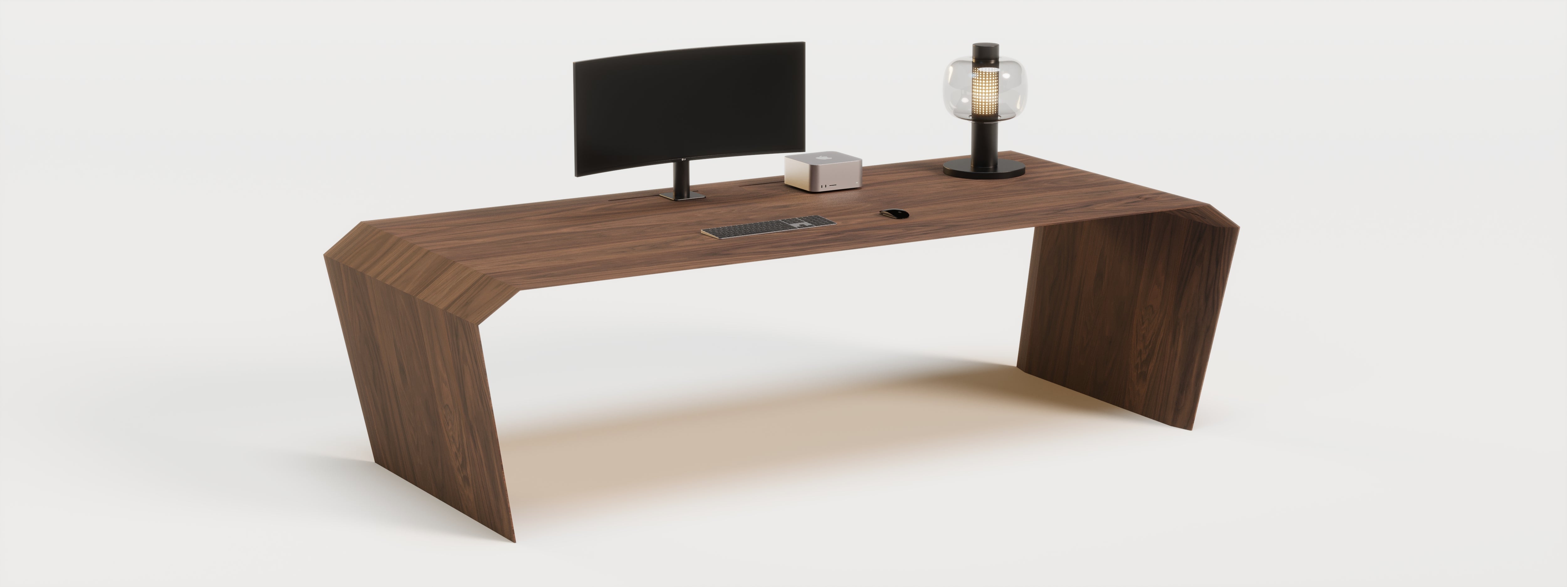 Der speziell entwickelte Kabelschlitz führt Kabel unsichtbar und ermöglicht gleichzeitig die Montage ausgewählter Monitorarme. Ein passgenauer Holzblock schließt die Öffnung bündig ab – für ein minimalistisches Setup ohne Kompromisse.